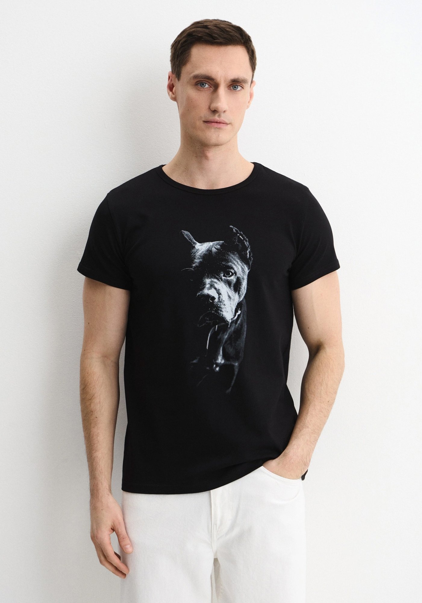 Мужская чёрная футболка прямого кроя с круглым вырезом ворота и коротким рукавом, выполнена из высококачественного турецкого трикотажного полотна кулирная гладь. Основной акцент- стильный монохромный принт с потрясающей собакой Кане-корсо, или итальянский мастиф — крупные собаки родом из Италии. «Корсо» обычно связывают с островом Корсика. Принт на изделие нанесён с помощью метода шелкографии, он отличаются яркостью и насыщенностью цветов. Такие принты сохраняют свой первоначальный вид на протяжении долгого времени, не выцветают и не стираются, не трескаются и очень приятны тактильно. Трендовый дизайн нашей футболки обязательно привлечет к себе внимание. Каждый элемент в дизайне наших изделий продуман до мелочей. Качественный состав ткани обеспечивает комфорт и гарантирует высокую износостойкость. Наша футболка обязательно станет стильной частью Вашего повседневного гардероба. Мужская футболка сочетается с классической и спортивной обувью. Отличный вариант для занятий спортом, прогулок, рыбалки, охоты, похода и повседневной носки. Она станет лучшим подарком мужу, сыну, любимому или папе. Гладить с изнанки. Стирка при t не более 30С. Деликатный отжим, отбеливание запрещено. При соблюдении наших несложных правил ухода одежда DS будет радовать Вас долгое время!