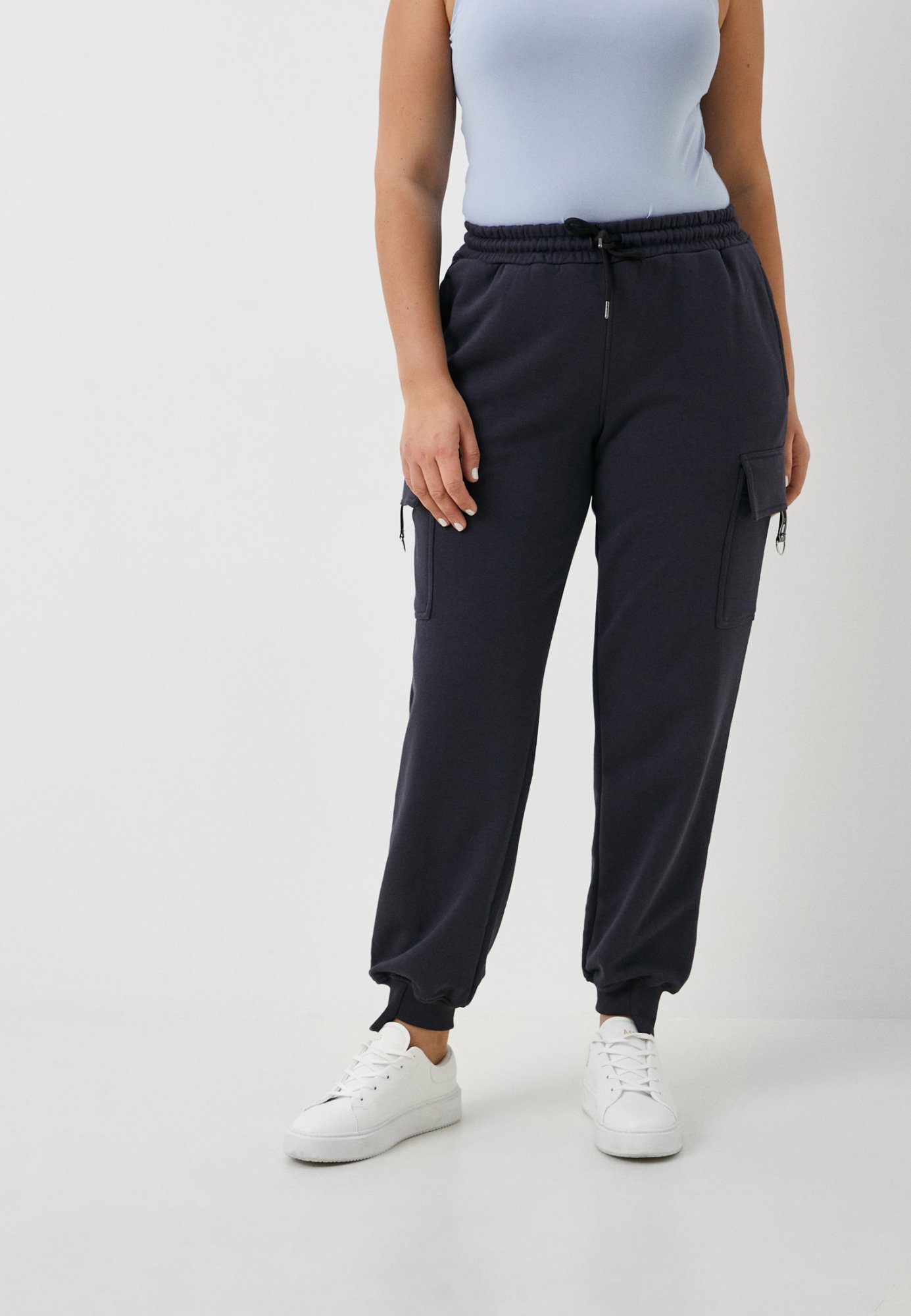 Женские спортивные брюки джоггеры в стиле карго размерной сетки SIZE+, выполнены из высококачественного турецкого футера 3-ех нитки без начеса. Комфортная высокая посадка создает элегантный силуэт, визуально удлиняет ноги и делает бёдра более изящными. На поясе брюк удобная и широкая резинка, шнур внутри пояса для возможности регулировки по фигуре. В данной модели имеется четыре функциональных кармана: два вдоль боковых швов, расположены в верху брюк, и два накладных кармана с клапанами по бокам изделия на линии бедра. По нижней части клапанов декоративный элемент из брендированной репсовой ленты со светоотражающими полосками, нижняя часть которой закреплена металлическим полукольцом. По низу изделия ассиметричные манжеты, которые ещё больше удлиняют и вытягивают силуэт. Свободный крой не стесняет Ваших движений. Отличный вариант для прогулок, занятий спортом и повседневной носки. Гладить с изнанки. Стирка при t не более 30С. Деликатный отжим, отбеливание запрещено.