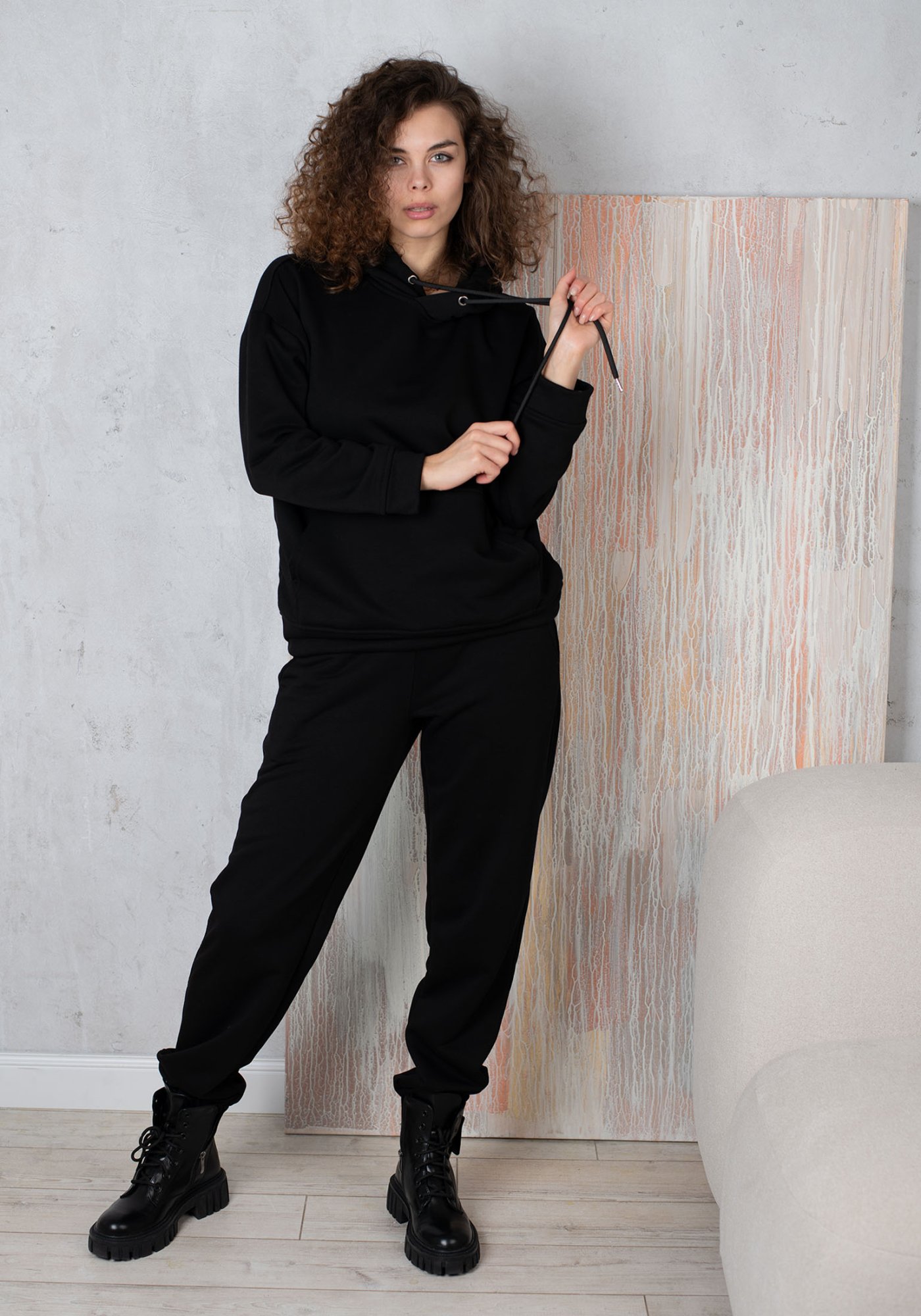Стильный женский спортивный костюм выполнен из футера 3-ух нитки без начеса. В комплекте: худи и джоггеры из мягкого хлопка. На поясе брюк удобная и широкая резинка под шнуровку, что позволяет дополнительно регулировать изделие по объему, два боковых кармана. Худи свободного кроя, с удобным карманом «кенгуру». Модель без застёжки. Капюшон худи регулируется шнуром, несъемный. Эта универсальная модель подходит для повседневной носки, школы и спорта, на физкультуру, для активного отдыха, горнолыжного спорта, рыбалки, охоты и прогулок, туристических походов осенью, весной, зимой и холодными летними вечерами. Эффект оверсайз (OVERSIZE) достигается при выборе модели на размер больше. Трендовый дизайн делает наш костюм стильной частью повседневного женского гардероба! Наш актуальный костюм будет прекрасным подарком на новый год, к 8 марта, день святого Валентина, на день рождение, на день матери. Сделано в России с любовью к Вам! Гладить с изнанки. Стирка при t не более 30С. Деликатный отжим, отбеливание запрещено.